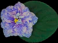 Soft pink, double star, with a light raspberry edge, that is lightly fringed. Each flower is decorated on the flower face with blue fantasy flecks. A thin white geneva edge surrounds each flower. The standard growing foliage is dark green and serrated. A real beauty!