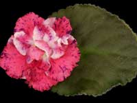 Semidouble pink frilled star with a thin red sparkle band, white edge. Medium green foliage, quilted. Large.