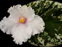 Semidouble, white frilled pansy with a pink eye and edge. Variegated, medium green and white, plain, ruffled, and serrated foliage.