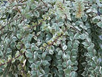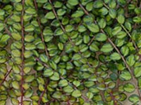 Tiny, nearly round leaves, are medium to dark green, with golden variegation and red blossoms in the spring, beautiful year-round.