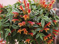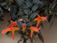 Commonly called "dancing dolphins" or "Shark Plant" because of the interesting bloom shape. Columnea flowers come in striking shades of red, orange, yellow and combinations of these colors, and most varieties will make nice hanging basket plants. South and west windows are best for compact growth. Requirements for artificial lighting is 12 to 14 hours daily. Baskets may be grown outdoors in shaded areas during the summer. Let soil become slightly dry between waterings. Use a light porous potting mix. Feed plants regularly, using a well balanced fertilizer, at ¼ tsp. per gallon of water, with every watering. Fertilizer may be increased to ½ to 1 full tsp. per gallon of water during spring and summer, when plants are actively growing, depending upon the size of the plant. (Larger plants can handle more fertilizer.)
