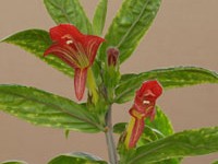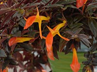 Compact chocolate brown leaves are ovate and pointed. Flowers are scarlet with a yellow-orange throat.