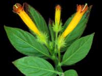 Wine red hairs cover the branches of this variety. The corolla has wine red hairs outside with lemon yellow tubes, wine red at the base, and scarlet edging upon the lobe edges. Dark green foliage.