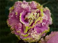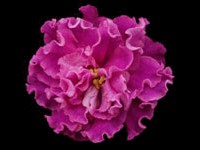 Large, semidouble purple flowers with fantasy markings along the edge of some petals, with wavy edges and a green fringe. Dark green quilted foliage. Standard.