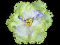 Semidouble white with blue splashes, green ruffled edge. Standard.