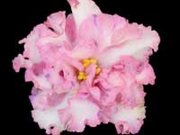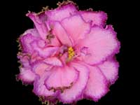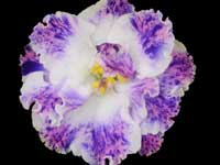 Single to semidouble white ruffled star with blue-fantasied pink patches. Medium green, plain, pebbled foliage. Standard.