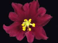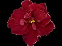 Semidouble to double dark cherry-red large ruffled star. Dark green, quilted, serrated. Standard.