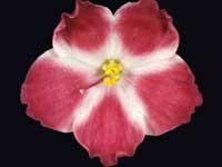 Large single to semidouble white star, with pink thumbprints, fuchsia fantasy edge. Variegated, medium green and white, plain. Standard.