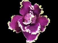 Large single to semidouble purple star, with a white wavy edge. Variegated, medium green and white foliage, plain. Standard.
