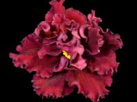Double pink, large ruffled flower with blue fantasy. Medium green, pointed, and serrated. Standard.