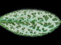 Semi-compact, strong silver markings over medium green, fleshy and hairy leaves. Lavender flowers.