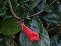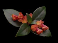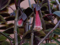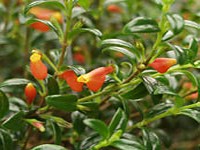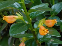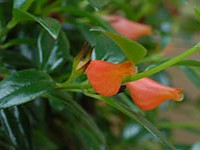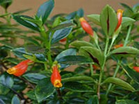 Stiff, upright growing. Distinguished from other nematanthus species having upside down flowers by the nearly equal, oblong, tip-pointed leaves. Also remarkable for the long, narrow corolla tube, scarcely swollen, which is scarlet with an orange throat. Medium green foliage.