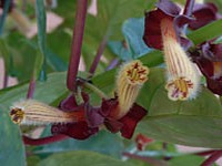 Many dark, rich, burgundy flowers, which are unusual, in that the pouch is on the top side, are produced upon medium green foliage.